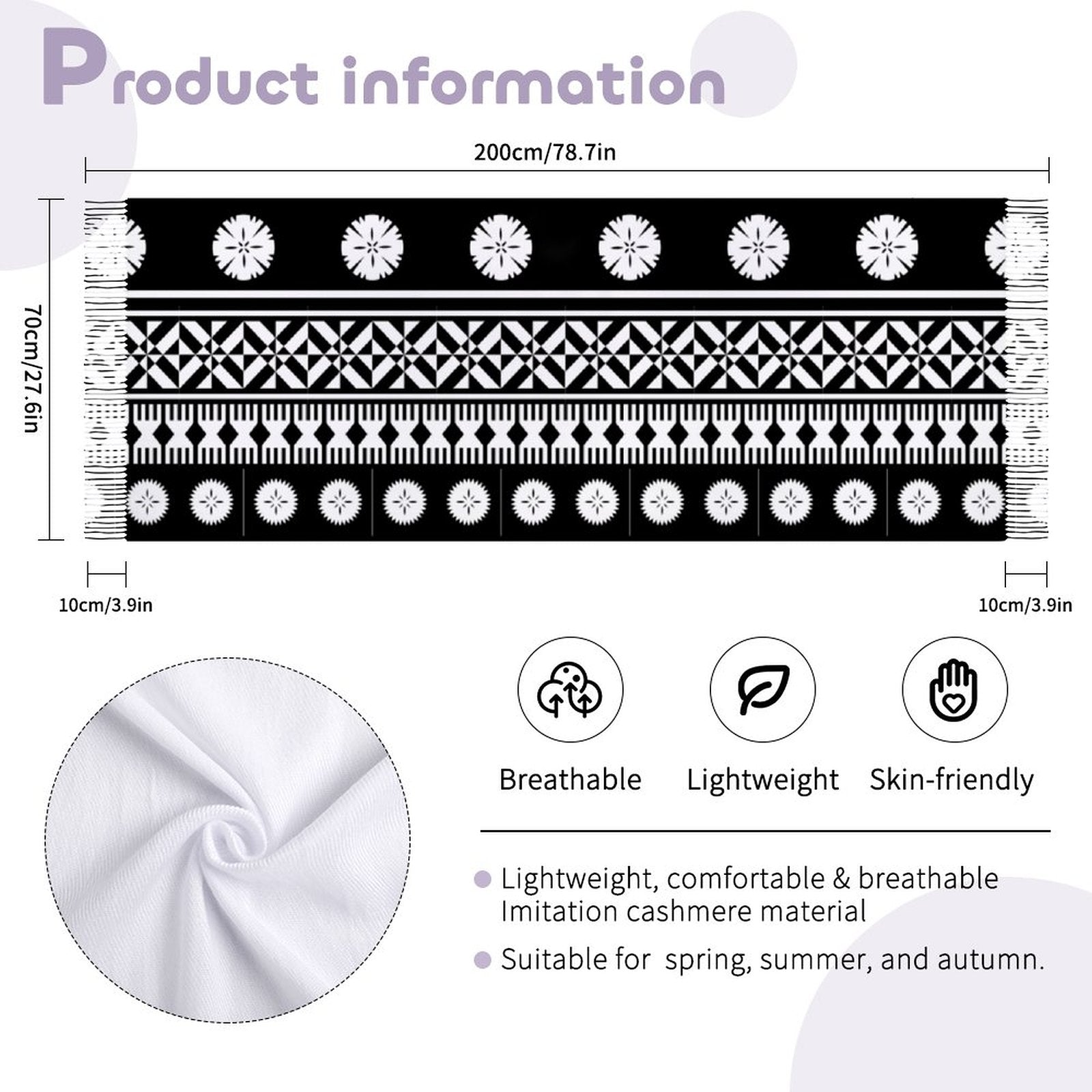 Crafted with quality cashmere-like material, our Cashmere-like Tassel Scarf boasts a luxurious softness and comfortable texture. The lightweight and breathable fabric ensure a comfortable wearing experience, allowing you to flaunt your style effortlessly. Featuring a sophisticated all-over printing technique, this Cashmere-like Tassel Scarf is customized to meet your unique demands, showcasing distinctive patterns that exude charm, confidence, and style on special occasions like parties, gatherings, and travels. Its timeless tassel style never goes out of fashion, seamlessly complementing a wide range of outfits, from coats and jackets to caps and jeans. With excellent color retention and durability, this Cashmere-like Tassel Scarf maintains its vibrant look even after prolonged use, making it a stylish and enduring addition to your wardrobe.