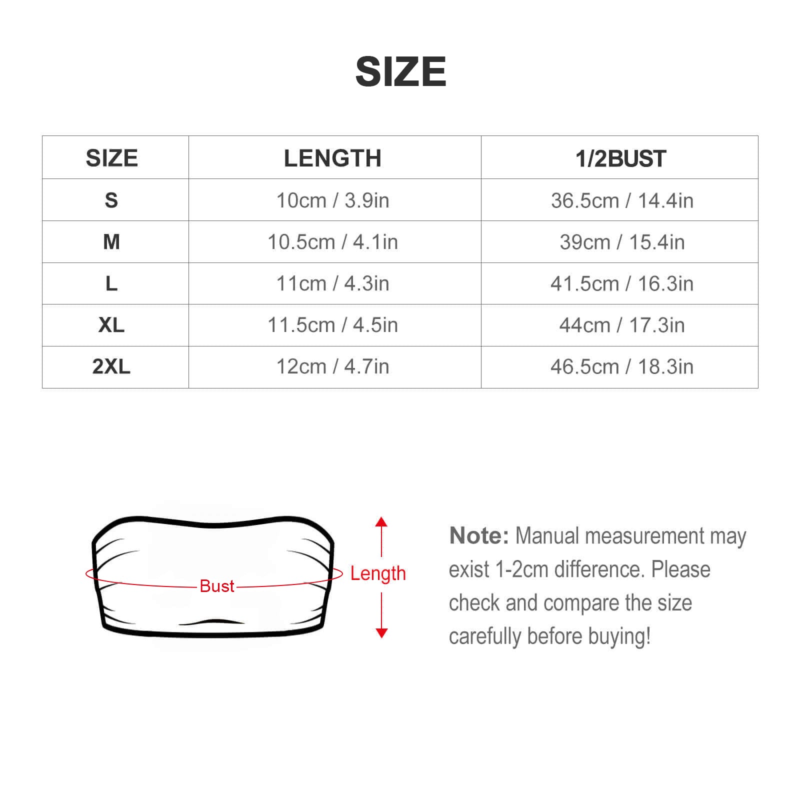 Size | Length (cm/in) | 1/2 Chest (cm/in) |